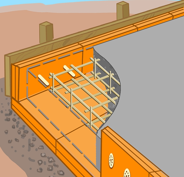 30. В выемку U-образных блоков укладывается арматурный каркас. Диаметр арматуры и марка бетона для заполнения подбирается по расчету в зависимости от воспринимаемой нагрузки.