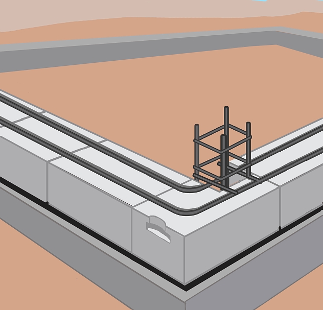 22. На углах и пересечениях стен армирование выполнять неприрывно с загибом по форме стены. Для армирования использовать стальную или композитную арматуру периодического профиля. Стальная d=8мм, композитная d=6мм. При стыке арматуры увязывается хомутами или вязальной проволокой.